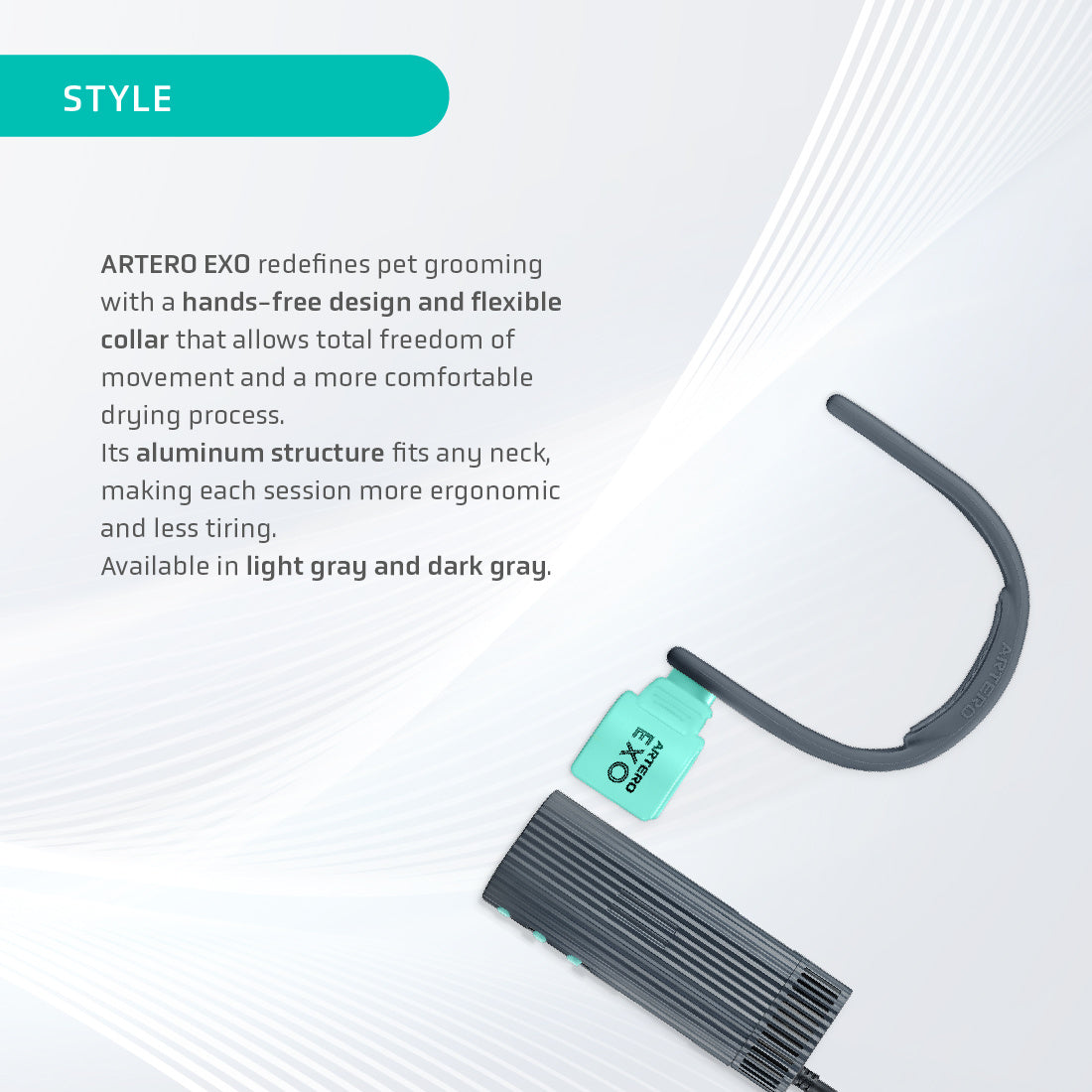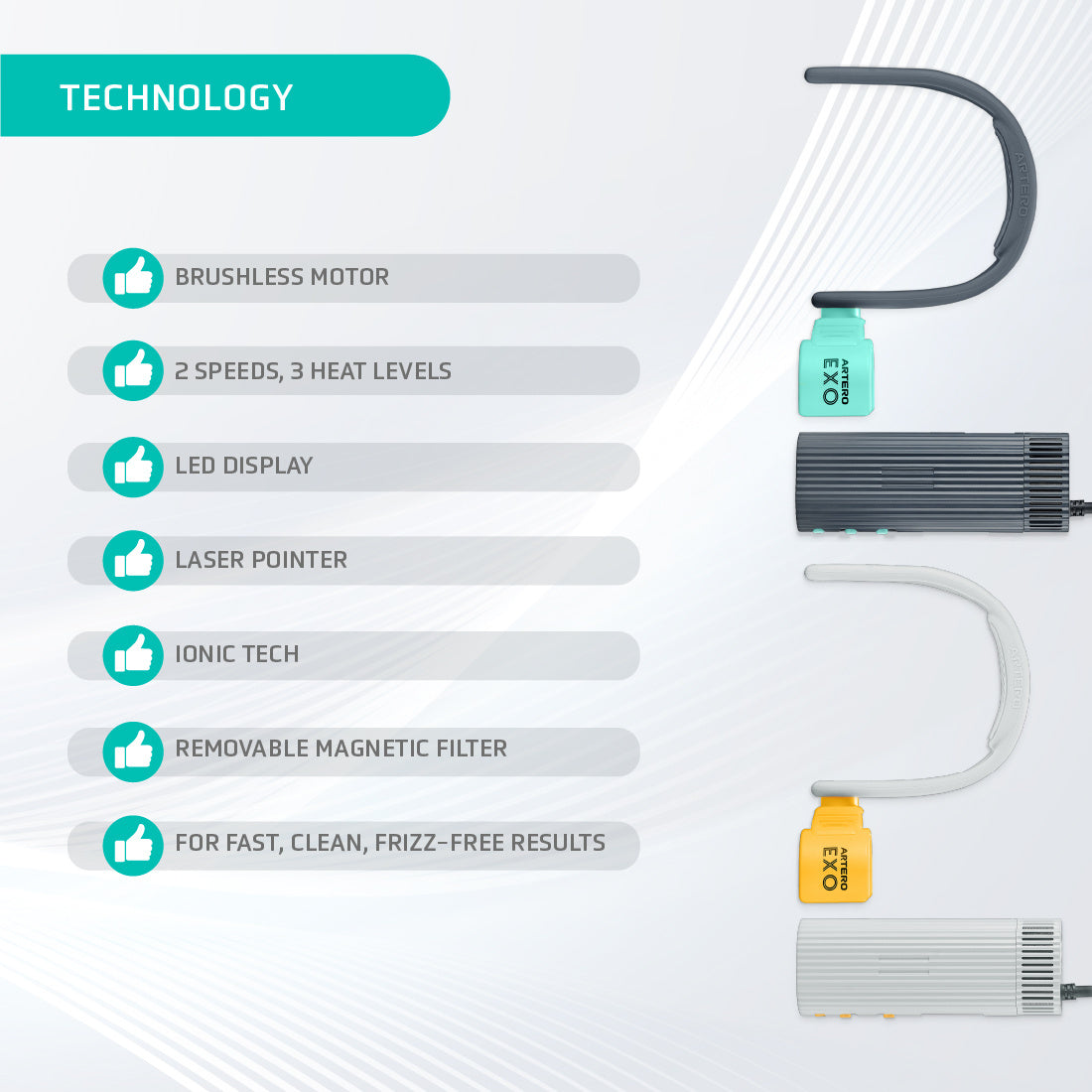 Séchoir à cou mains libres avec un grand débit d'air et des ions négatifs. Moteur Brushless à haut débit. Économie de consommation électrique avec une performance maximale. Avec une entrée d'air par l'arrière. Filtre aimanté amovible. Pointeur laser indiquant le point de focalisation de l'air pour optimiser le travail. 2 vitesses et 3 points de chaleur. Écran LED indiquant la vitesse et la température. Collier en caoutchouc avec une structure interne en aluminium flexible qui peut être modulé. Pièce de fixation du séchoir articulée pour pouvoir s'orienter sous n'importe quel angle. Séchoir amovible. Idéal pour étirer les cheveux pendant le séchage.