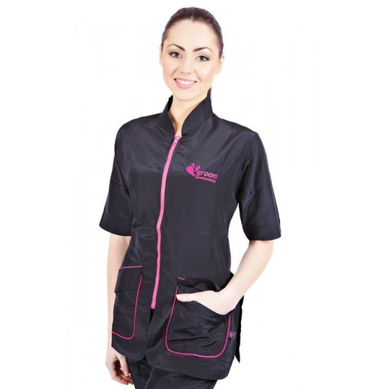Stylish fitted jacket. Full length zip. 2 pockets with covered flap Inverted pleat in the back for extra comfort. Inverted pleat in the back for extra comfort. Embroidered Groom Professional logo. Hair resistant material *As these jackets are small, we advise you to take 1 or 2 Available in pink and mint colors.